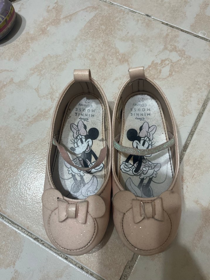 Bej renkte, lastik malzemeden yapılmış kız çocuk babetleri, tokalı kayış ve baskılı Minnie Mouse deseniyle sokak stiline uygun.