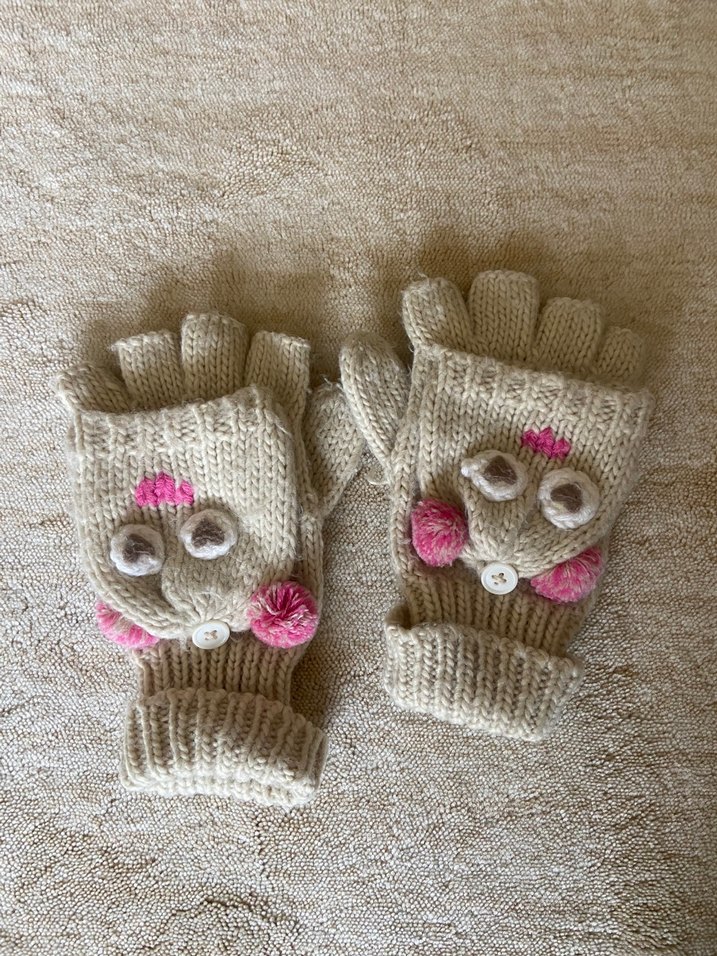Bej renkli, işlemeli detaylara sahip örgü kız çocuk eldiveni. Parmaksız ve bohem tarzda, gri ve pembe tonlarında nakışlıdır.