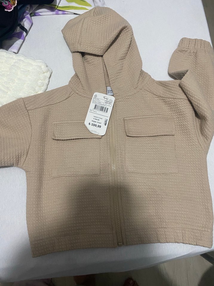 Kız çocukları için bej renkli, fermuarlı ve kapüşonlu dar kesim ceket. Yumuşak, dokulu kumaştan, iki ön cepli sade sokak stili.