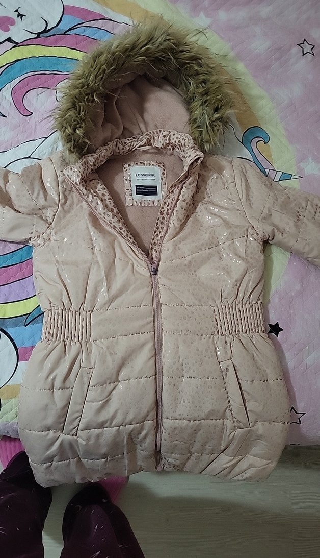 Bej renk kapüşonlu, kürk detaylı, sentetik kumaşlı kız çocuk montu. Trendy ve rahat sokak stili için uygun.