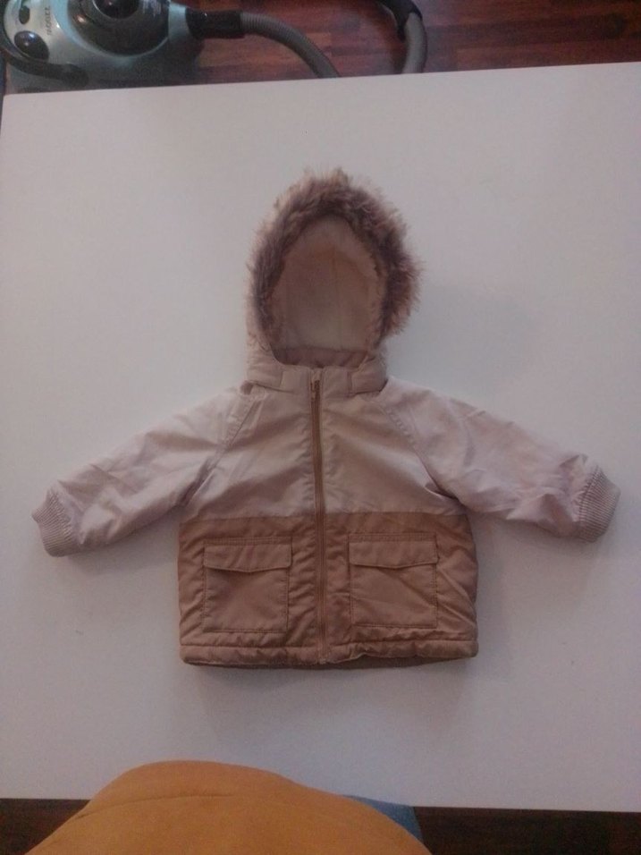 Erkek bebek kapüşonlu, kürk detaylı ve pastel bej tonlarında, yumuşak ve sıcak kumaştan yapılmış mont.