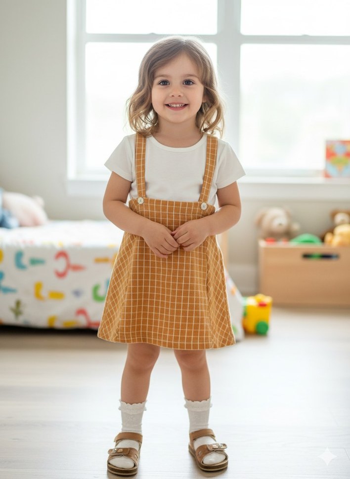 Pamuk kumaştan yapılmış, bej renkli kareli, askılı ve kısa kollu rahat kesim kız çocuk elbisesi.