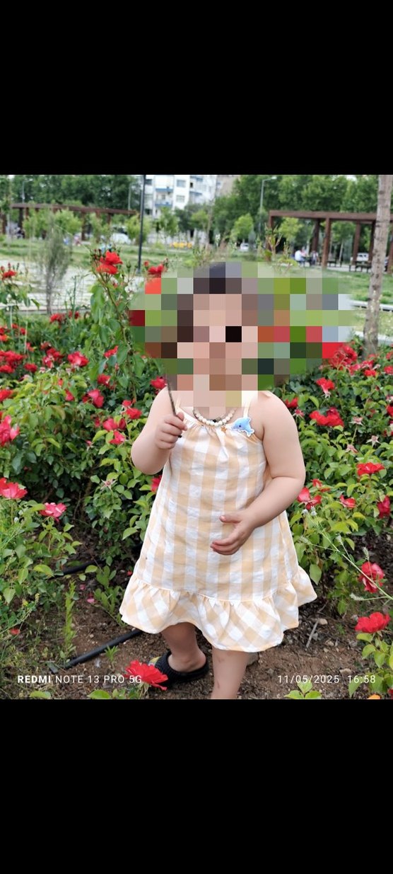 Kız çocukları için bej kareli, askılı, bol kesim, fırfırlı etek uçlu elbisedir.