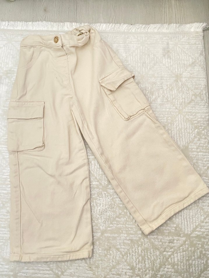 Yumuşak pamuklu bej renkli, bol kesim kız çocuk pantolonu. Kemerli bel ve yan ceplerle sokak stiline uygun.