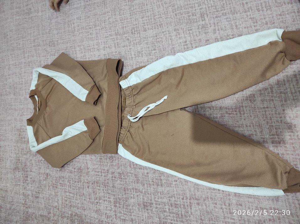 Bej renkli, kemerli ve beyaz yan şeritli kız çocuk eşofman altı. Rahat kesimli, sentetik kumaştan, sokak modasına uygun tasarım.