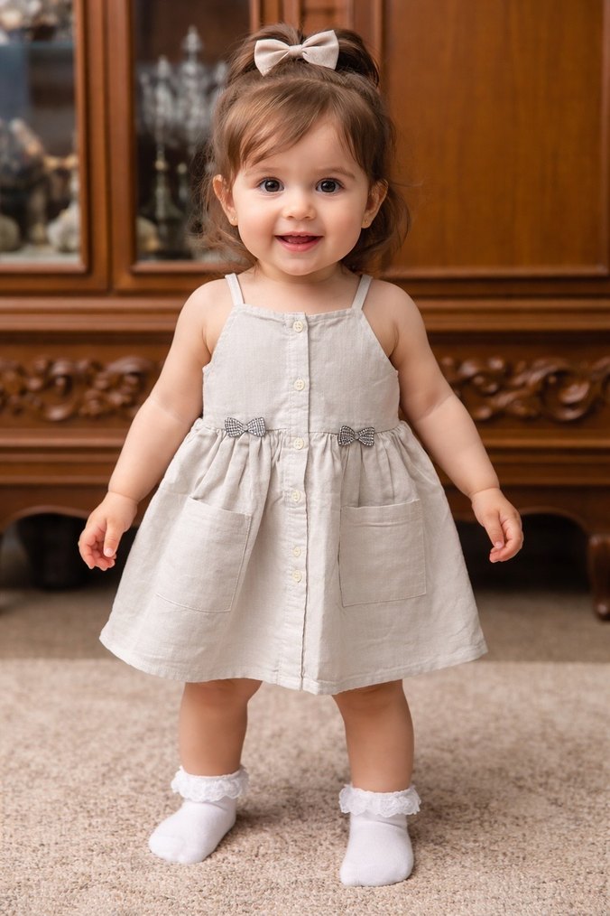 1,5 yaş bebek elbisesi , % 100 pamuklu kumaş açık gri üzeri taşlı fiyonklu çok cici bir elbise hiç Kullanılmamıştır etiketi üzerindedir Kız çocukları için keten kumaştan, düğmeli ve işlemeli detaylara sahip bej renkli, askısız, bol kesim elbise. Bohem tarzda rahat bir model.