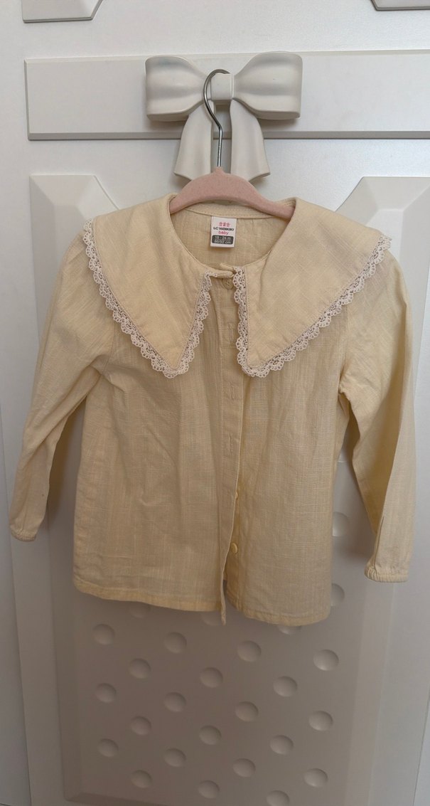 Dantel detaylı yakalı, düğmeli, keten kumaştan yapılmış bej renkli uzun kollu kız çocuk gömleği. Bol kesim ve desensiz tasarıma sahiptir. Hiçbir sorunu yoktur tertemizdir.