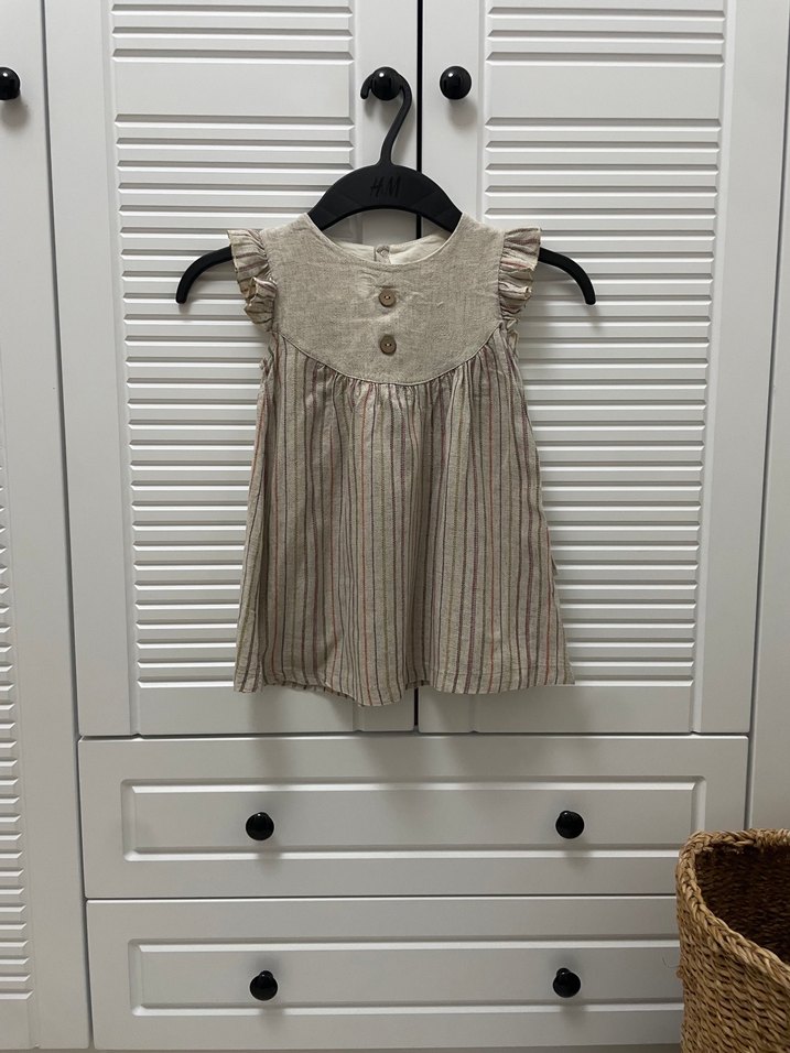 Keten kumaştan yapılmış, bej renkli, çizgili, pileli ve salaş kesim kız çocuk elbisesi. Kolsuz ve kayık yaka detaylı, bohem tarzda bir model.