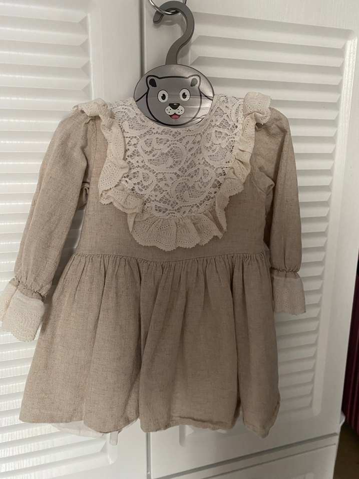 Uzun kollu, yakalı ve fırfırlı dantel önlü bol kesim bej keten kız çocuk elbisesi. Yumuşak, doğal dokulu ve desensiz bohem tarzda. Le Mabelle den alınmıştır