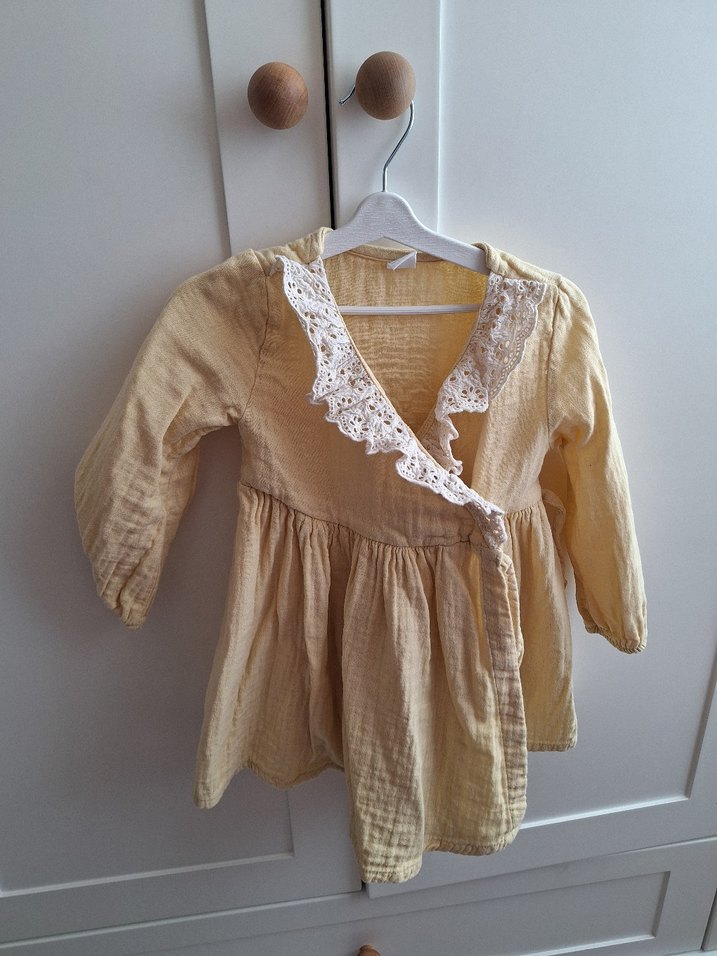 Bej keten kumaştan, V yakalı ve dantel fırfırlı uzun kollu kız çocuk elbisesi. Bol kesimli ve bohem tarzda, retro görünüm sunar.