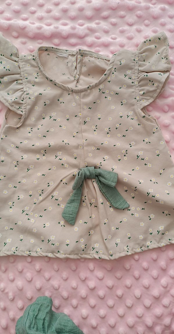 Kız çocuk bej renkte, kısa fırfırlı kollu ve yuvarlak yakalı bol kesim elbise. Yumuşak kumaştan, küçük çiçek desenli, belinde yeşil fiyonk detaylı.