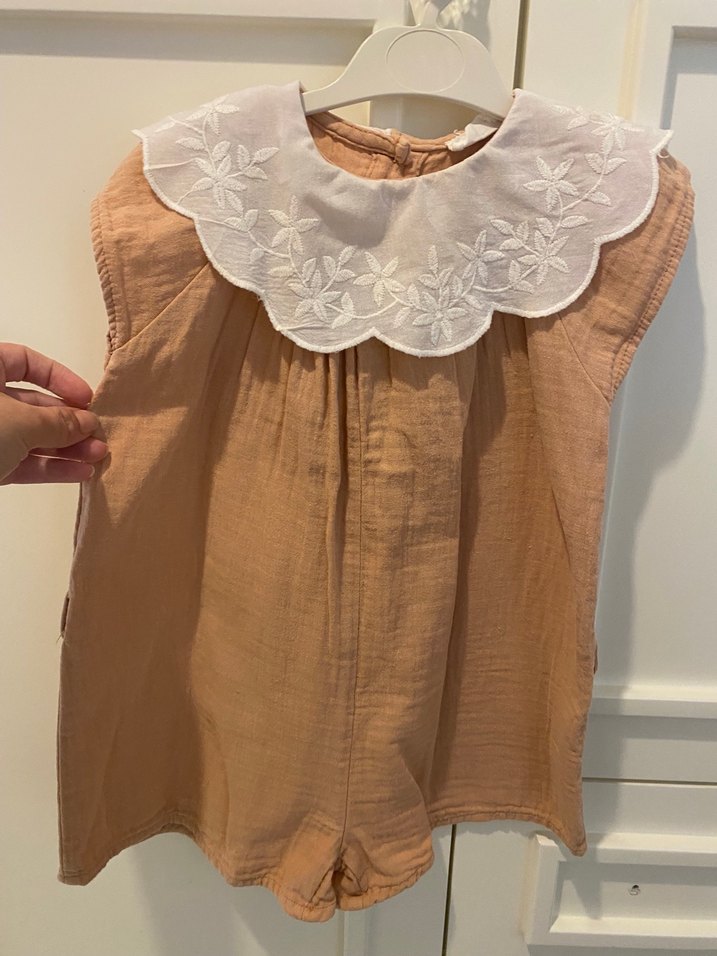 Kız çocuklar için keten, bej renk, fırfırlı beyaz nakışlı yaka ve kolsuz, bol kesim bluz. Pastel tonlarda, bohem tarzda tasarım.