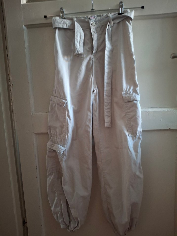 Kadınlar için kemerli, cep detaylı bej keten pantolon. Rahat kesimi ve midi boyuyla günlük sokak modasına uygundur.