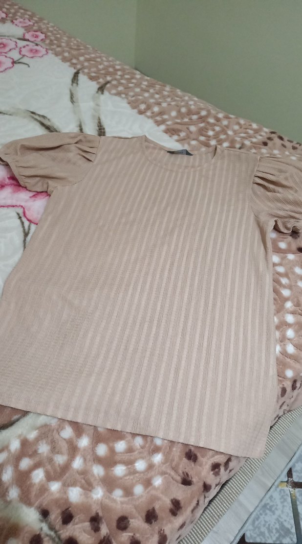 Keten kumaştan, kısa kollu, bej renkli, pileli detaylı, yuvarlak yakalı, bol kesim kız çocuk bluzu.
