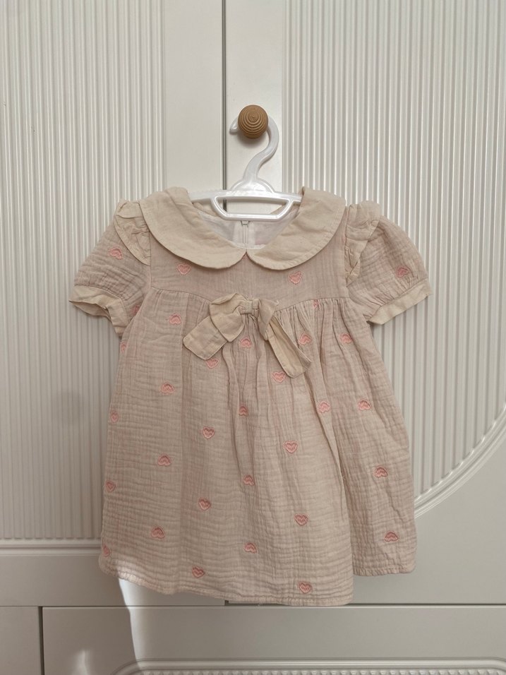 Kız çocukları için kısa kollu, keten kumaştan, yakalı ve fırfırlı detaylara sahip, pastel nakışlı bej renk vintage tarz elbise.