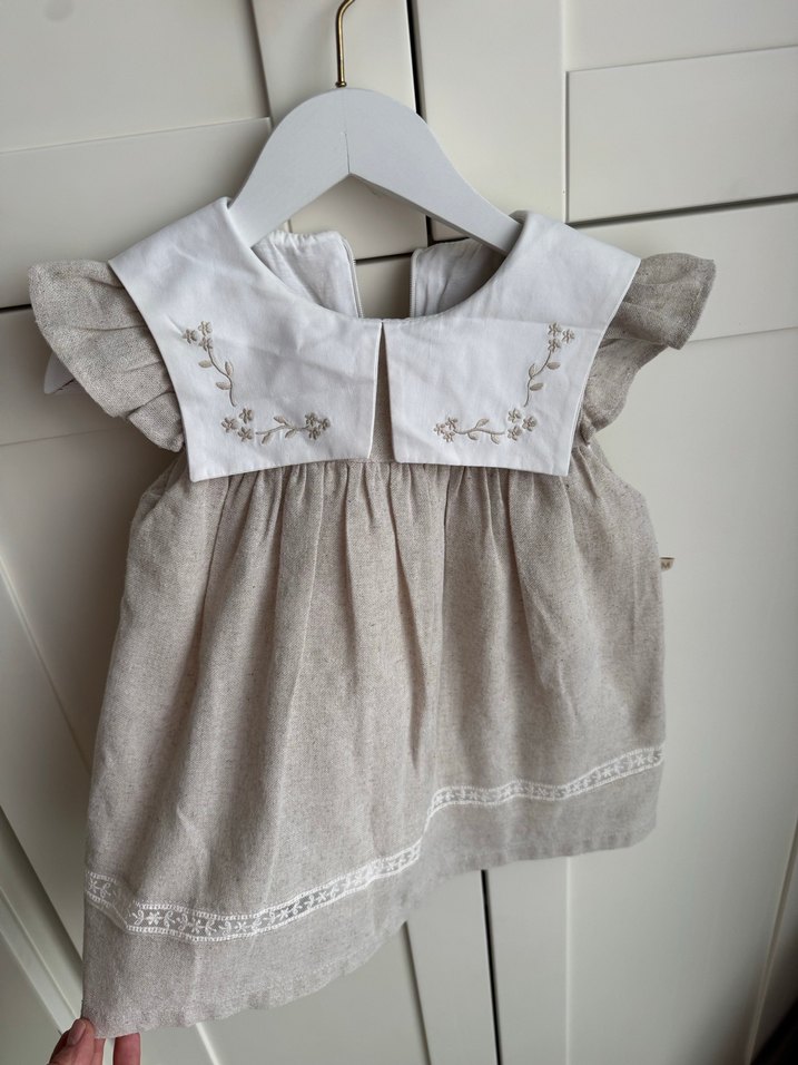 Bej keten kumaştan yapılmış, nakış işlemeli yakalı, kısa fırfırlı kollu ve bol kesimli vintage tarzda kız çocuk elbisesi.