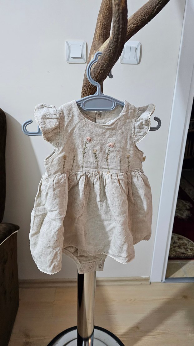 Bej keten kız çocuk elbisesi, nakışlı çiçek desenleri ve fırfır detaylarına sahiptir. Yuvarlak yaka, kısa kollu ve bohem tarzda. pamuk keten çok az giyildi. deformesi yok . giyince çok şık duruyor. zengin kumaşı var zaten. yakışıyor.