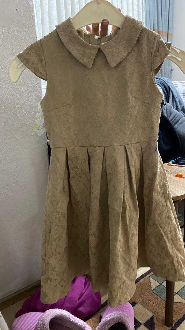Kız çocukları için bej keten, yakalı ve pilili etekli, kolsuz elbise. Bohem tarzda, klasik görünümlü, vücuda oturan model.
