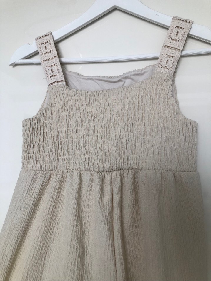 Bej keten kumaştan yapılmış kız çocuk elbisesi, straplez yakalı ve askılıdır. Pliseli detaylara sahip, salaş kesimiyle bohem tarzda tasarlanmıştır.