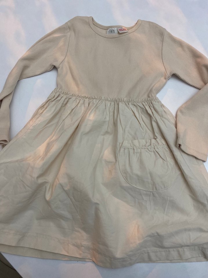Bej keten kumaştan yapılmış kız çocuk elbisesi, uzun kollu ve yuvarlak yakalıdır. Rahat bir kesime sahip olup küçük bir cep detayı bulunur. Şık ve sade bir tarza sahiptir.