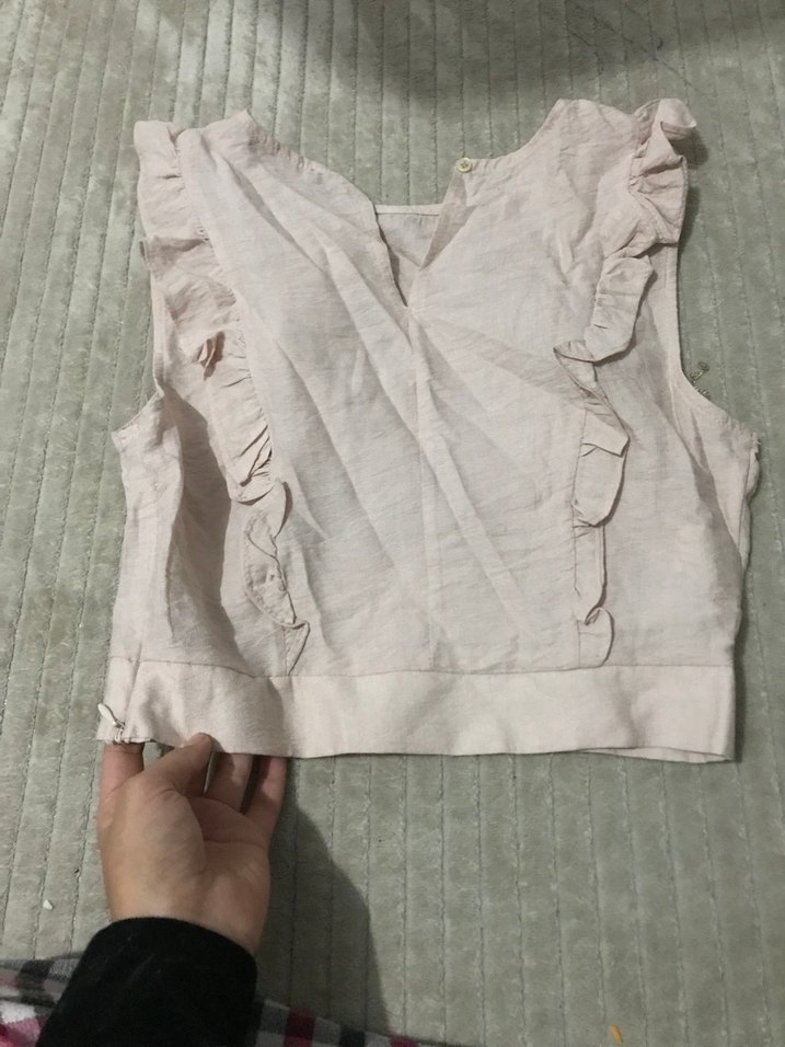 Bej keten kumaştan, V yaka ve volan detaylı, bol kesim kolsuz kız çocuk bluz, yumuşak ve bohem tarzda.