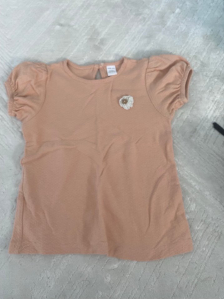 Kız çocukları için bol kesim, kısa kabarık kollu, yuvarlak yaka bej tişört. Küçük baskılı çiçek ve arkada düğme detayı bulunur. Yumuşak ve sıcak kumaştan yapılmıştır.