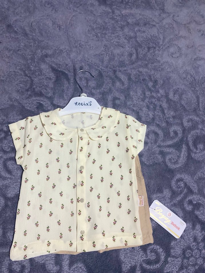 Pamuklu, kısa kollu, yakalı ve düğmeli bej kız çocuk gömleği. Gevşek kesim ve ince baskılı desene sahip, trend sokak stili için uygundur.