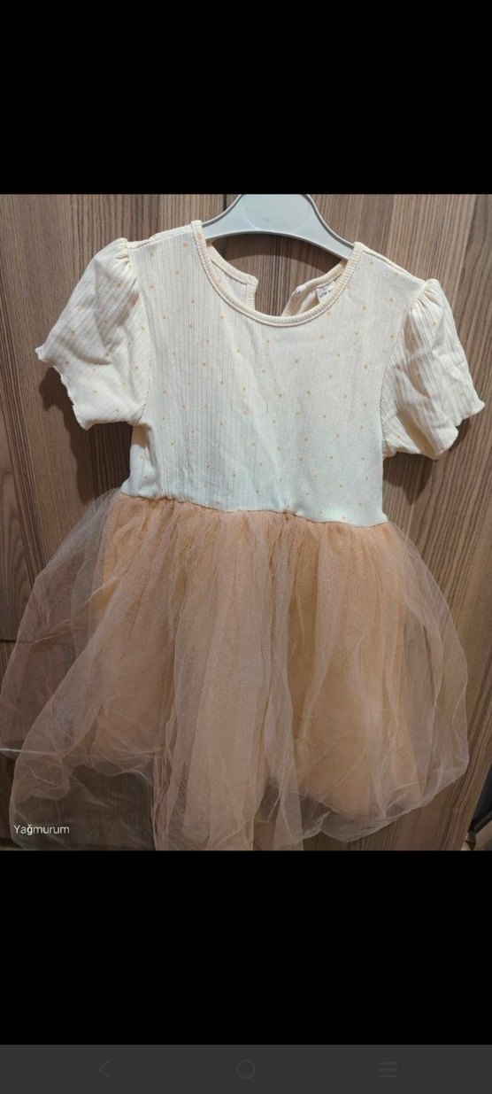 Bej renk, pamuk kumaştan yapılmış, kısa kollu, yuvarlak yakalı ve fırfırlı kız çocuk elbisesi. Pastel tonlarda, bohem tarzda ve 'Yağmurum' markalıdır.