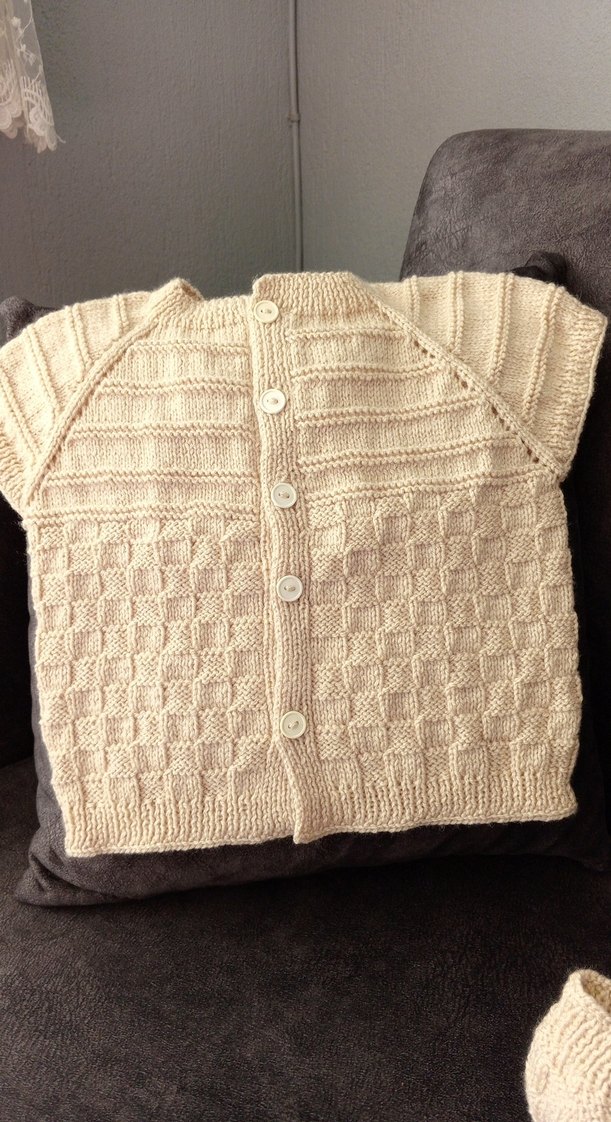 Kız çocukları için bej renkli, kısa kollu, düğmeli vintage tarzda örgü hırka. Yumuşak örgü kumaştan yapılmıştır.