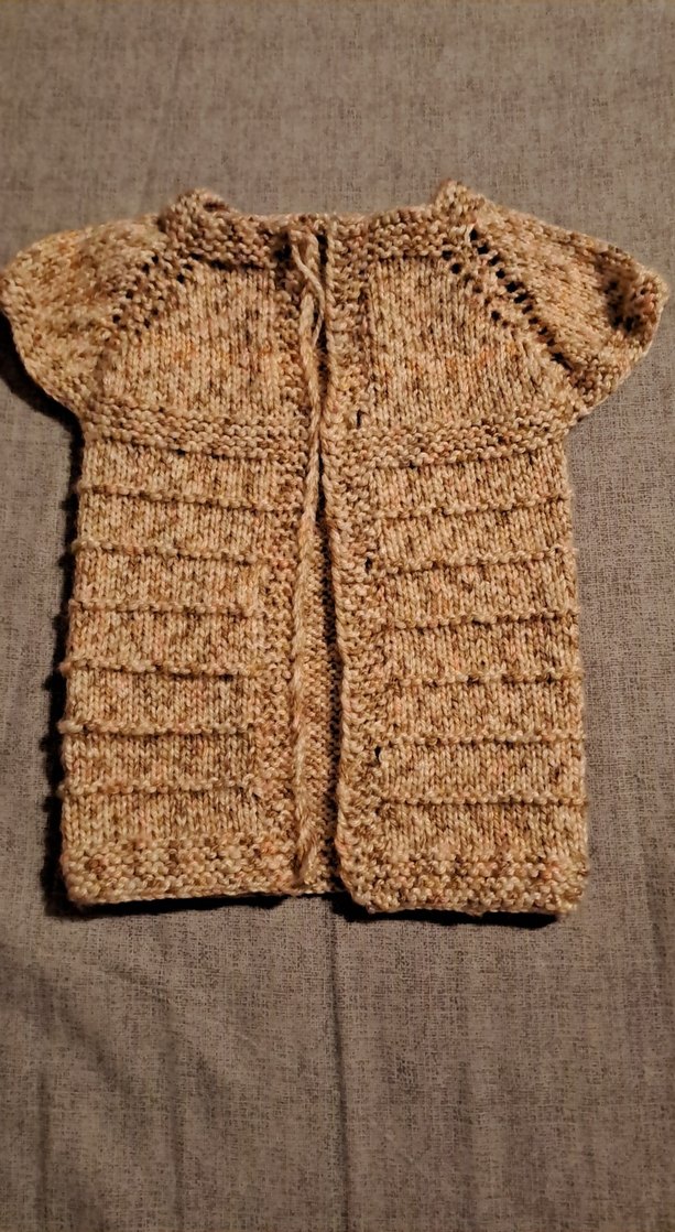 Kısa kollu, bej renkli, örgü dokulu ve bohem tarzda kız çocuk hırkasıdır. Düz desensiz ve yumuşak triko kumaştan üretilmiştir.
