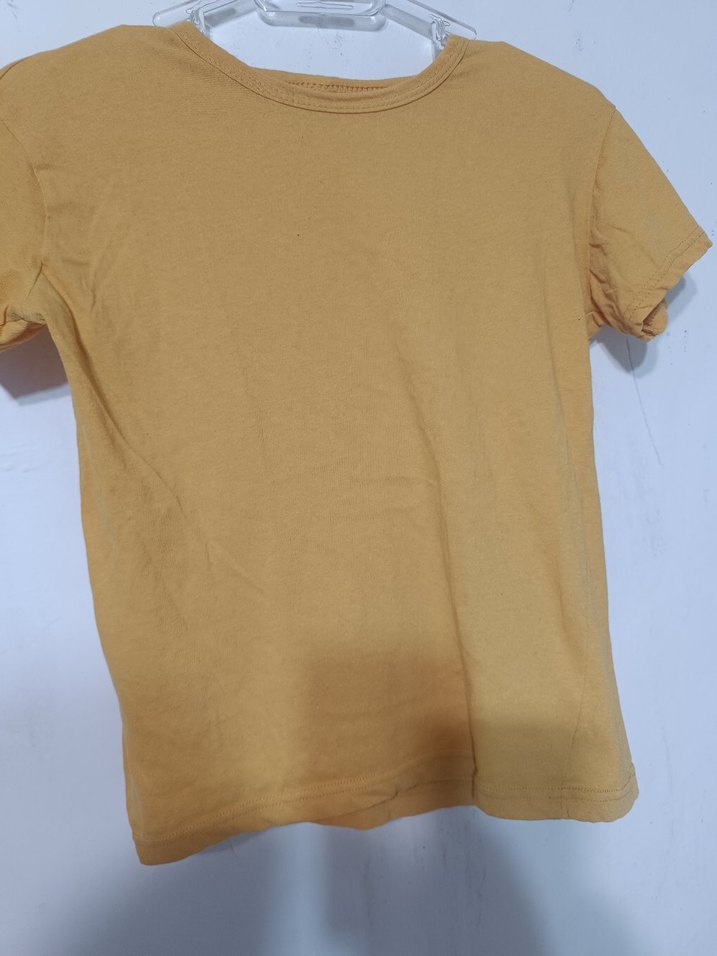 Kısa kollu, bisiklet yaka kız çocuk tişörtü, yumuşak keten kumaştan, pastel bej renkte. Sade ve şık, streetwear tarzında, vücuda oturan kesim.