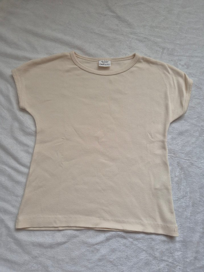 Bej renkli kız çocuk tişörtü, yuvarlak yaka ve kısa kolludur. Pamuklu kumaştan üretilmiş, rahat ve sade bir görünüm sunar.