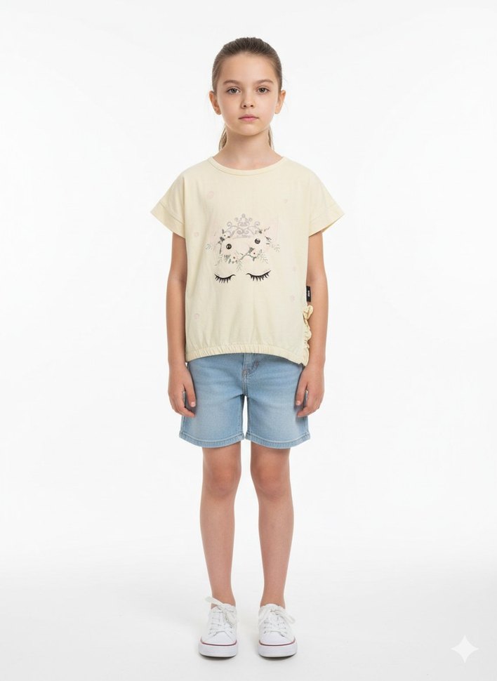 Bej renkli, kısa kollu kız çocuk tişörtü, bol kesim ve yuvarlak yakalıdır. Denim kumaştan üretilmiş, rahat ve şık bir görünüm sunar.