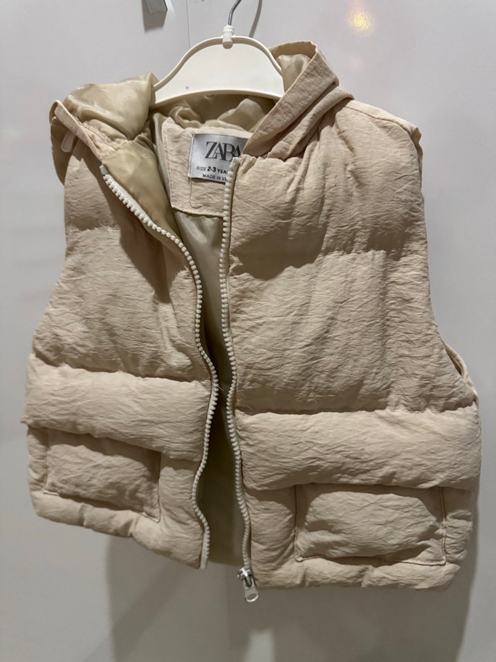 Kız çocukları için bej renkli, kolsuz ve fermuarlı yelek. Yüksek yakalı, yumuşak keten kumaştan, dar kesim ve pastel sade tasarıma sahip.