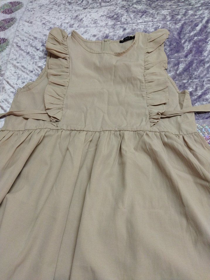 Kolsuz, bej renk kız çocuk elbisesi, yumuşak keten kumaştan, fırfır detaylı ve bol kesim. Askısız yaka bohem tarzı yansıtıyor.