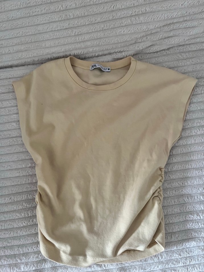 Kız çocukları için keten kumaştan, kolsuz ve yuvarlak yakalı, bol kesim bej tişört. Düz ve desensiz tasarımıyla rahat ve şık bir sokak stili sunar.