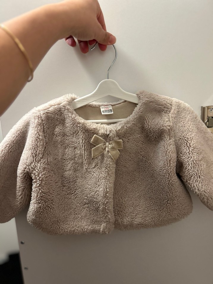 Kız çocukları için uzun kollu, yuvarlak yakalı, yumuşak ve sıcak kumaştan yapılmış, kürk detaylı ve önünde küçük fiyonk bulunan dar kesim bolero.