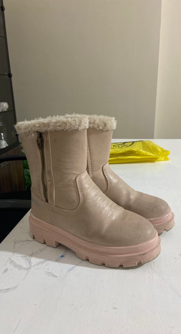 Fermuarındaki detayı koptu ancak kullanıma engel değildir Kız çocukları için bej pastel tonlarda, yumuşak ve sıcak kumaş ile kürk detaylı botlar. Yan fermuarlı ve kalın tabanlı, rahat ve gündelik normcore tarzda..