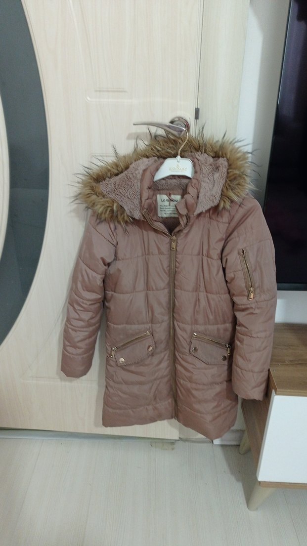 Kız çocukları için bej renkte, kapüşonunda kürk detaylı, sentetik yumuşak kumaştan yapılmış, dar kesim mont. Notch yaka ve sokak stili tasarım içerir.