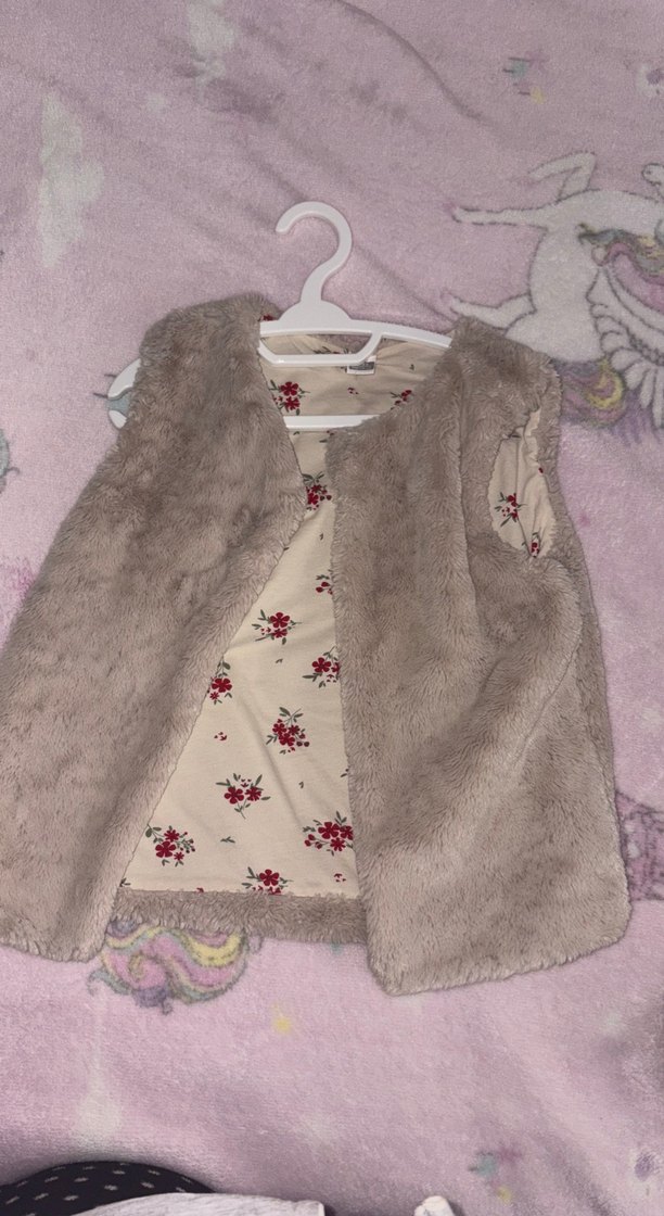 Kız çocukları için bej renkli, yumuşak sentetik kürk detaylı ve straplez yaka modelinde, bohem sokak stili uyumlu yelek.