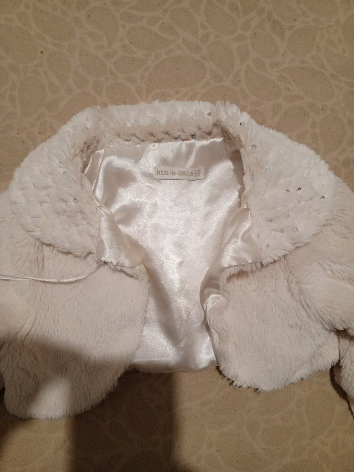 Bej renkli, uzun kollu, kesik yakalı, kürk detaylı ve içi parlak astarlı kız çocuk bolero.