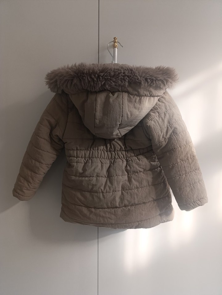 Kız çocukları için bej rengi, yumuşak ve sıcak kumaşlı, kürklü kapüşon ve kesimli yakaya sahip, sokak stiline uygun mont.