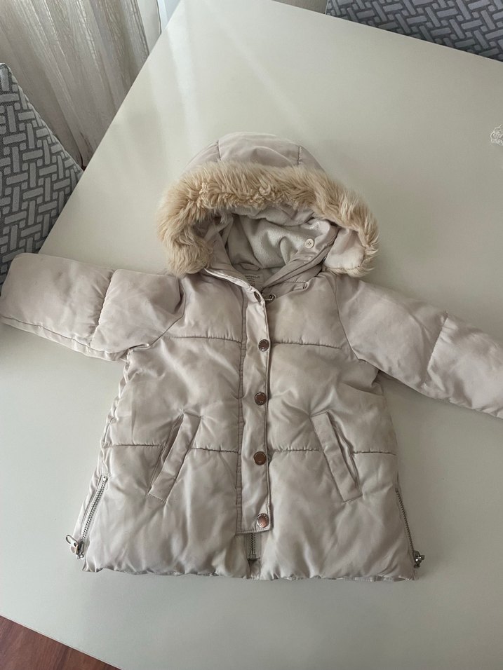 Kız çocukları için bej renkli, kürklü kapüşonlu ve kesimli mont. Yumuşak ve sıcak tutan fleece kumaştan üretilmiştir, sokak stili sunar.