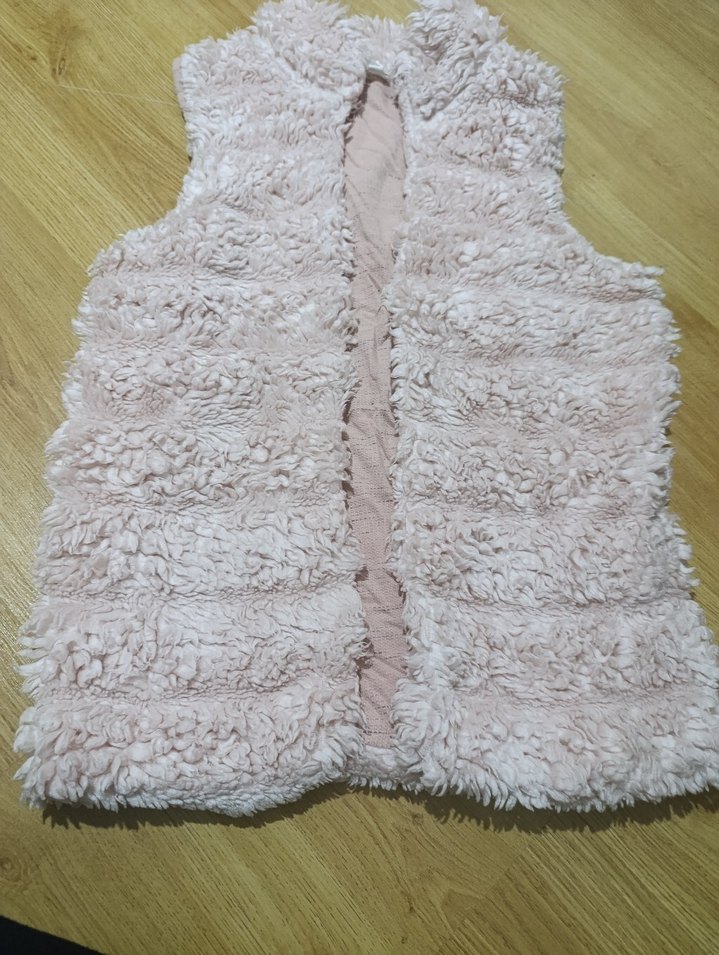 Kız çocukları için yumuşak sentetik kürk detaylı, kolsuz, bej pastel renkli ve fitted kesim yelek. Askısız yaka tasarımı bulunur.