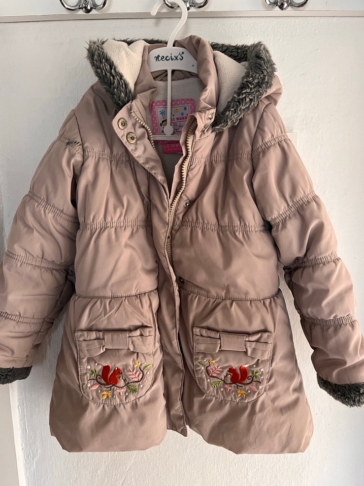 Bej renkli, nakışlı cepleri ve kapüşon ile manşetlerde kürk detayları olan, yumuşak fleece kumaştan yapılmış kız çocuk montu. Notch yakalı ve sokak stili.