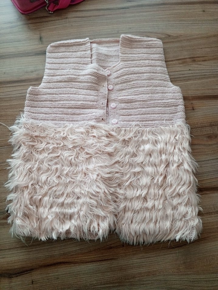 Kolsuz, V yaka ve bol kesim bej triko yelek, alt kısmında yumuşak kürk detaylı bohem tarzda.7-8 yas