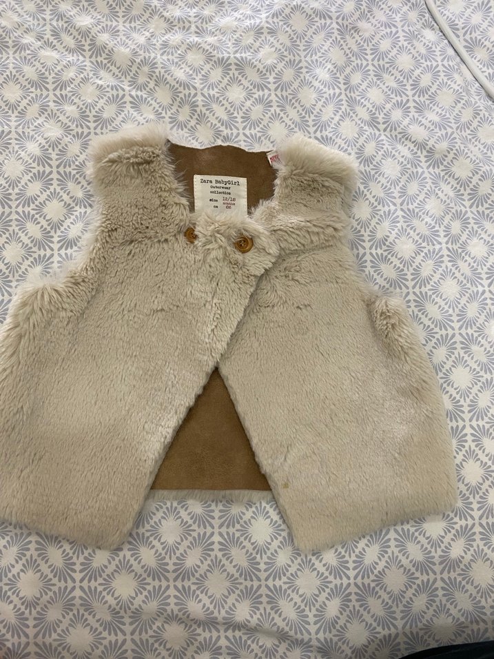 Bej renkte, kürk detaylı, kolsuz ve yakalı kız çocuk yeleği. Nakış desenli, bohem ve retro tarzda, vücuda oturan kesime sahip.