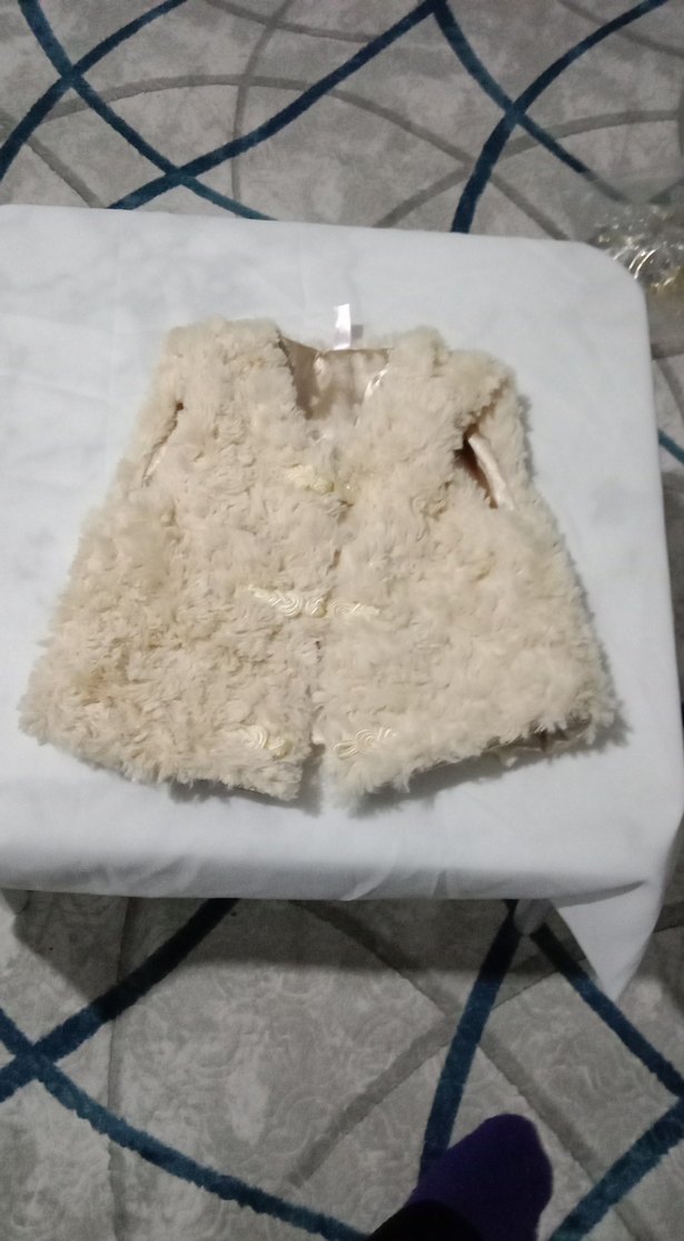 Kız çocukları için kolsuz, dar kesim bej renkli yumuşak kumaştan, kürk detaylı ve çentikli yakalı yelek. Bohem tarzında, pastel tonlarda.