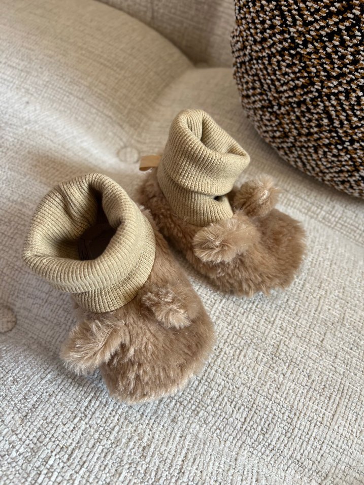 Kız çocukları için bej renkli yün terlik, yumuşak kürk detayları ve nakışlı bohem tarzıyla sıcaklık ve rahatlık sağlar.