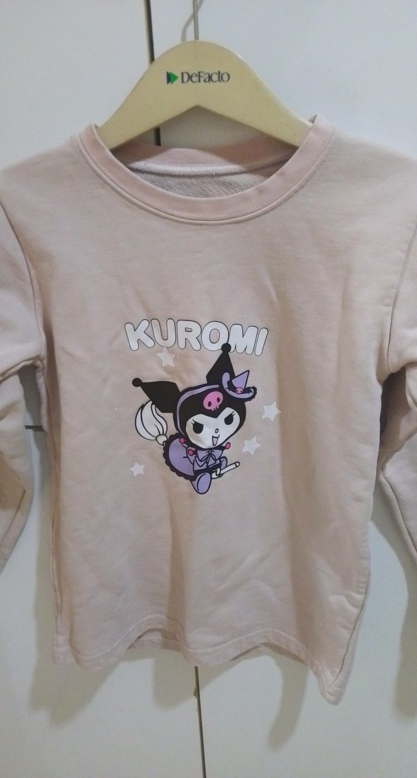 Pamuk kumaştan yapılmış, uzun kollu, düz kesim, bej tonlarında Kuromi baskılı kız çocuk tişörtü. Örme detaylar içerir. 6,7,8 yaş uyumlu.sadece arkada hafif bır leke var.iki koltuk altı arası 36 cm,boy 52 cm